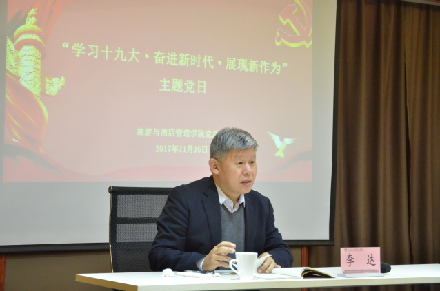 本网讯 (旅游与酒店管理学院) 11月16日下午,旅游与酒店管理学院在国际交流中心二楼会议室举行“学习十九大·奋进新时代·展现新作为”主题党日活动,学院党委书记李达、副院长刁洪斌,旅游与酒店管理学院党总支副书记徐莉以及旅游与酒店管理学院党员教师和本年度学生党员发展对象参加活动。活动由徐莉主持。