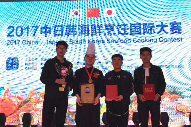 本网讯 (烹饪学院 张会强) 11月29日,由青岛市港务局和黄岛区政府主办、青岛市饭店和烹饪协会协办的“2017中日韩海鲜烹饪国际大赛”在黄岛举行,我院烹饪学院丁德龙大师凭借高超技艺与稳定发挥夺得大赛金奖第一名。