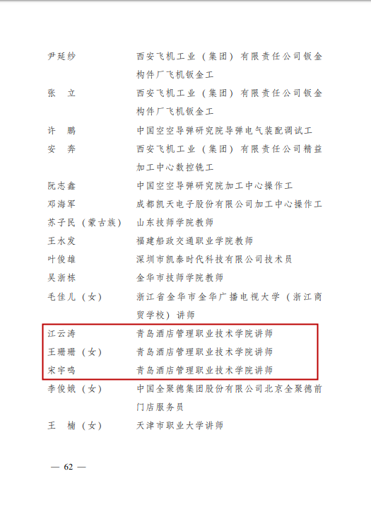 本网讯(烹饪学院 庞阳)近日,共青团中央、人力资源和社会保障部联合印发《关于命名表彰2016—2017年度全国青年岗位能手标兵和全国青年岗位能手的决定》(中青联发〔2018〕6号),授予40名同志“全国青年岗位能手标兵”称号,授予826名同志“全国青年岗位能手”称号。其中,我院烹饪学院宋宇鸣、王珊珊、江云涛三位老师赫然在列,获评“全国青年岗位能手”称号。