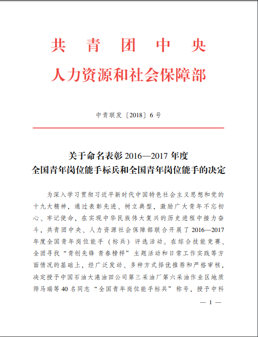 “2016-2017年度全国青年岗位能手(标兵)评选活动”是共青团中央、人力资源和社会保障部为深入学习贯彻习近平新时代中国特色社会主义思想和党的十九大精神,激励广大青年不忘初心、牢记使命,在实现中华民族伟大复兴的历史进程中接力奋斗联合开展的综合评选活动。奖项每两年评选一次,对被授予者只授一次,为终身荣誉。获奖人员在综合技能竞赛、全团寻找“青创先锋青春榜样”主题活动和日常工作实践等方面的基础上,经广泛发动、多种方式择优推荐和严格审核确定。