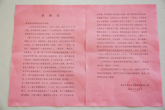 本网讯(党委宣传部 李代玉)9月6日,学院收到了来自青岛市李沧区兴华路街道党工委一封表扬信,特别感谢王羽帆同学,她在8月29日晚和弟弟一起用智慧和勇气拯救了一个鲜活的生命,挽救了一个家庭,向王羽帆同学提请表扬。