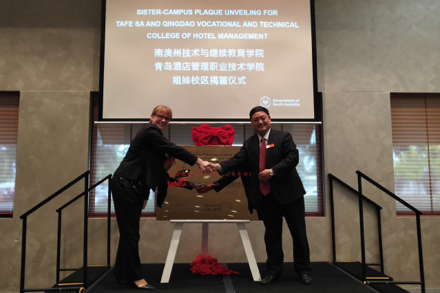 28日上午,揭牌仪式在南澳技术与继续教育学院丽晶校区(Regency Campus)举行,南澳技术与继续教育学院校长李娜(Alex Reid)、副校长布莱特·莫哈尼(Brett Mahoney)、全球战略发展总监贾飞霞(Laura Jia)、南澳州政府代表格雷格(Greg)等领导出席仪式。仪式伊始,李娜、刁洪斌代表双方院校致辞。在愉快的氛围中,李娜与刁洪斌共同为姐妹校区牌匾揭幕。学院与南澳技术与继续教育学院在山东省与南澳州政府友好省州合作这一大背景下开启合作历程,今年7月,两校在济南正式签署姐妹校协议,并在我院挂牌成立姊妹校区,此次在澳洲举行的揭牌仪式,象征着两校间联系更趋紧密,合作更上一层楼。双方将借助姐妹校合作的契机,进一步密切往来,全方位推进双方合作交流。