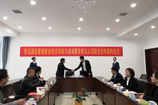 本网讯(酒店工程学院 薛陆)12月25日,学院与绿城物业服务集团有限公司公司青岛分公司举行校企战略合作共建签约暨冠名实训室揭牌仪式。绿城物业青岛分公司常务副总经理张怀林,学院副院长宫恩龙出席签约仪式,并共同为冠名实训室揭牌。