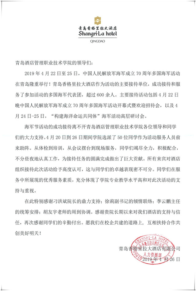 自今年3月收到青岛香格里拉大酒店关于选拔优秀学生服务中国人民解放军成立70周年多国海军活动的邀请后,学院高度重视、精心组织,经酒店方面试和层层筛选,共有50名专业能力突出、政治素质过硬的学生脱颖而出。经过近一个月的培训,50名同学全部被安排到活动现场服务。会后,青岛香格里拉大酒店特发来感谢信,对我院学生参与会晤接待表示了感谢和敬意,同时也对我院多年来在学生素质培养、学生活动管理及服务技能等方面所取得的成绩表示了充分肯定。