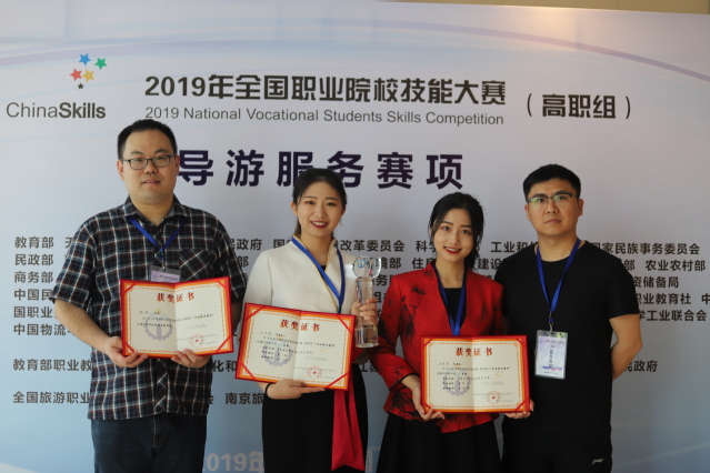本网讯(旅游与酒店管理学院 杨栋)5月27日至31日,2019年全国职业院校技能大赛(高职组)导游服务赛项在南京旅游职业学院举行,学院学子高阳以全国总分第四名的成绩获得一等奖,姜雪冰获得二等奖,杨栋老师获得优秀指导教师奖。