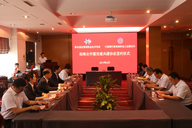 中国银行青岛市分行党务工作部、中国银行高科园支行相关人员,学院组织人事处、党委宣传部、财务处等部门负责人,各党总支、直属党支部书记参加签约仪式。