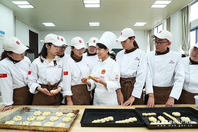 山东省教学名师、省级职业教育技艺技能传承创新平台负责人、齐鲁技能大师特色工作站负责人王桂云正在给必赢线路检测3003no1大二年级中西面点工艺专业的学生讲解维也纳面包的编花、搓条、刷蛋液等烹饪技巧。学院建有技能大师工作室,通过研究研发平台和销售平台,实现了“前店后厂”模式,目前在站的教师有15位。为深入贯彻落实全国教育大会精神,以奋进姿态迎接祖国70周年华诞,由教育部新闻办组织的“落实全教会 奋进迎华诞”1+1系列发布采访活动走进青岛,就深化新时代职业教育“双师型”教师队伍建设改革实施情况对必赢线路检测3003no1进行了采访。(张劲松/摄 姚振 谢沂楠/文)