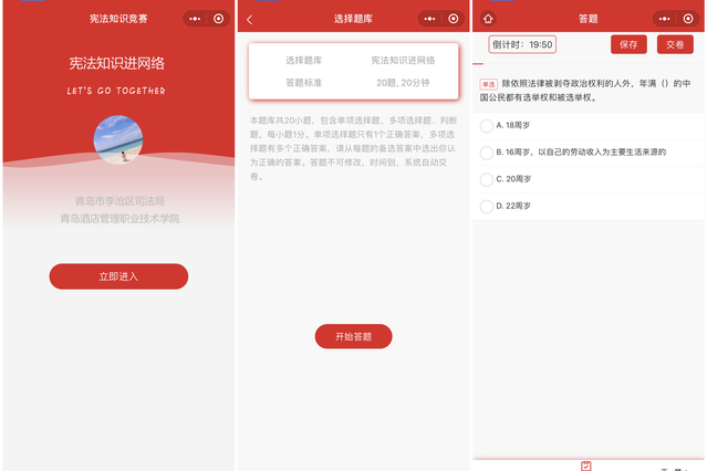 会上观看了由我院师生团队制作的宪法宣传微视频——“我们与宪法”,通过一幕幕生动画面,生动诠释了从呱呱坠地到耄耋之年,宪法贯穿我们的一生。同时,学院积极开展宪法知识网络竞赛,制作了宪法知识进网络微信小程序,参与答题共万余人次,起到了尊崇宪法、学习宪法、遵守宪法、维护宪法、运用宪法的良好效果。