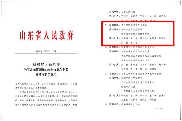 本网讯(文旅学院 朱丽男)3月16日,山东省人民政府下发《关于公布第四届山东省文化创新奖获奖项目的通报》(鲁政〔2020〕42号),由文旅学院教师团队与青岛市文化和旅游局合作完成的项目“青岛市研学旅游体系构建”榜上有名。