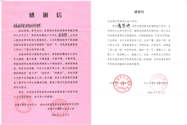 本网讯(会计学院 刘卿文)近日,会计学院收到了来自共青团白山市委员会和共青团抚松县委员的感谢信,对青年团员潘崇婷在基层积极参与联防联控表示感谢,对学院育人工作给予高度评价。