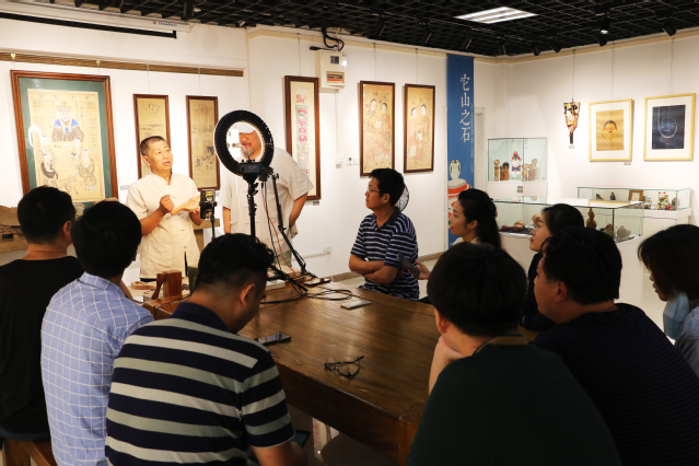活动利用线上直播和线下论坛相结合形式展开,青岛市民间文艺家协会副主席、青岛手工艺协会会长、青岛手工艺博物馆馆长鲁汉科普了端午节与榼子的关系和传承渊源,讲述了端午节的奇闻趣事、“五毒饼”食俗的渊源以及榼子的制作工艺。青岛饽饽榼子非遗传承人、青岛市工艺美术大师王丕文现场操刀,从选材、加工和雕刻等流程,为大众演示了榼子的制作方法。