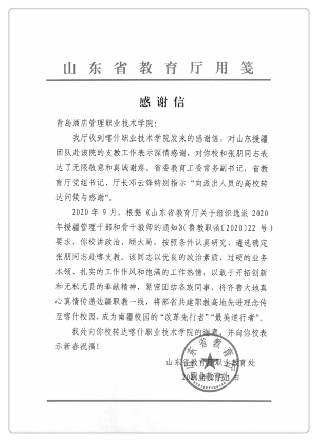 本网讯(酒店管理学院)近日,山东省教育厅发来感谢信,对学院讲政治、顾大局,认真研究遴选教师赴喀支教表示感谢,对学院教师张朋在边疆职教一线的无私奉献给予充分肯定。