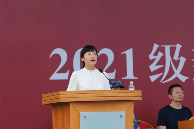 姜玲玲在主持典礼仪式时希望同学们鼓足士气、振奋精神,要不辜青春和朝气,不负韶华和期许,始终保持向前奔跑,感受探索未知的乐趣,圆满完成军训任务,全面规划大学生活,收获属于自己的精彩。