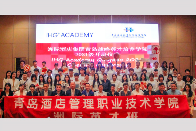 洲际酒店集团青岛地区6家酒店总经理和人力资源负责人,酒店管理学院院长冷雪艳、党总支书记徐莉、教师代表及2020、2021级洲际英才班全体学生参加开班仪式。