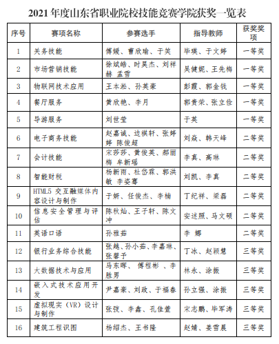 本网讯(教务处 宋玉莉)日前,山东教育厅发布《关于公布2021年全省职业院校技能大赛获奖名单的通知》,学院参赛团队共获奖项16个,其中一等奖5个、二等奖6个、三等奖5个,刷新全省职业院校技能大赛成绩新记录。
