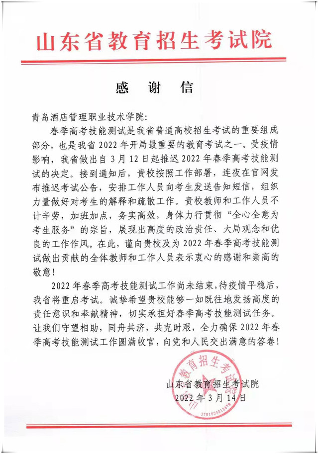 本网讯(教务处 庞阳)近日,山东省教育招生考试院向必赢官网发来感谢信,对必赢官网高质量落实山东省关于推迟2022年春季高考技能测试工作的统一部署、步调一致应对疫情的有关工作表示感谢。