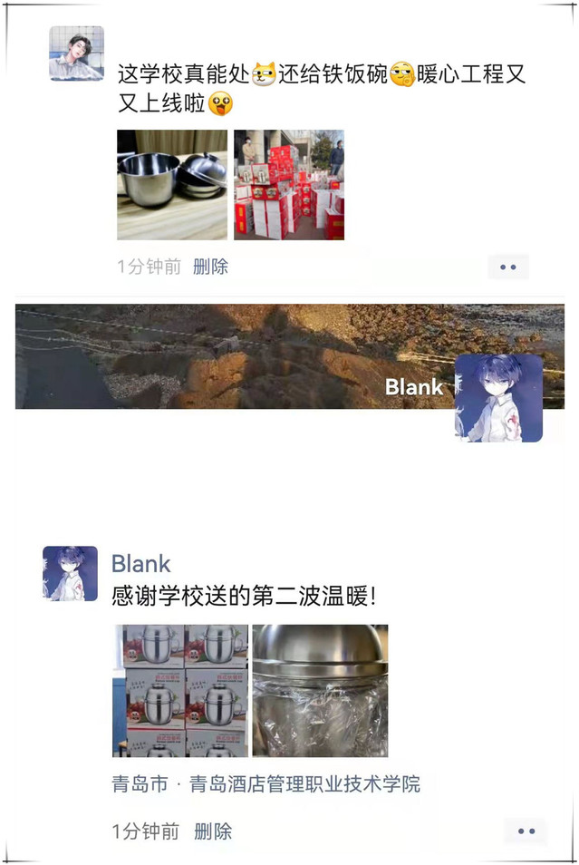 酒店工程学院一位同学领到餐具后,感慨地说:“好多年没用过饭盒了,疫情期间,我们在九水东路599号,收到过口罩,吃到了免费的水果,还领到了爱心餐具,感受到的是温暖和关爱,加油,一起战胜疫情,春天就在不远。”不少家长更是在家长联络群和学校官微留言,为学校一系列实实在在的体贴和关爱,表达了信任和祝愿。