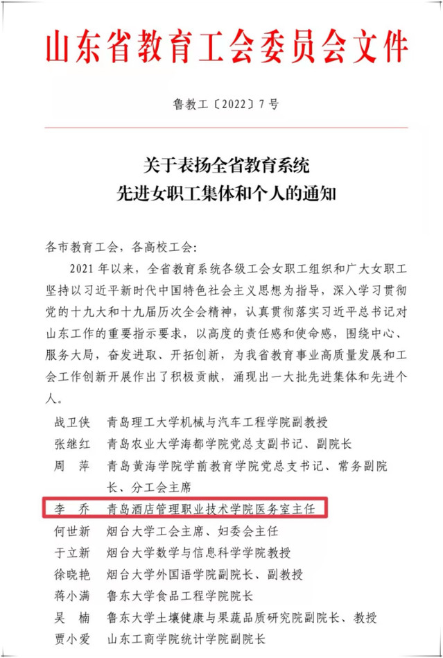 本网讯(工会 吴春雷)为表扬先进、树立典型,进一步激励全省教育系统广大女职工建功新时代、彰显新作为,近日,山东省教育工会委员会下发通知,评选表彰了一批全省教育系统女职工先进集体和个人,必赢官网医务室李乔同志被授予“山东省教育系统女职工建功立业标兵”荣誉称号。