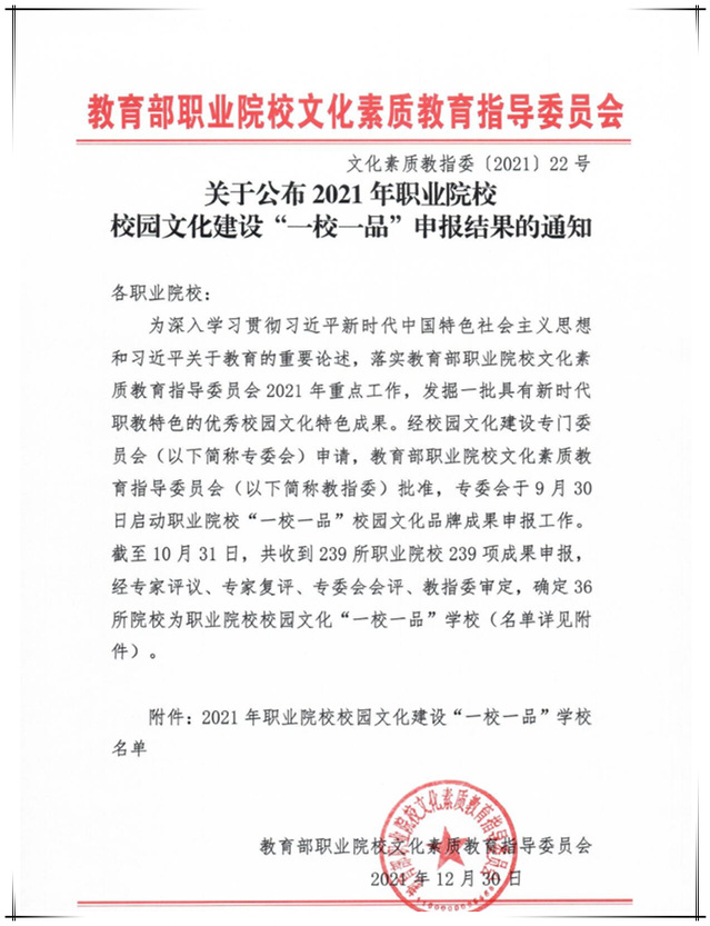 “一校一品”是凸显学校校园文化建设品牌、集中体现学校文化特质的重要项目,代表学校校园文化建设实践中的优秀成果。本次共有239所职业院校的239项成果申报评选,经专家评议、专家复评、专委会会评、教指委审定,最终确定了36所院校为全国职业院校校园文化“一校一品”学校。