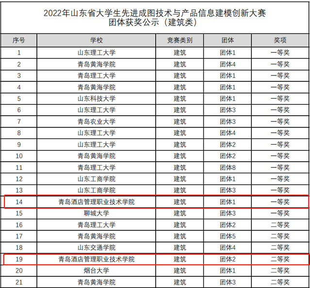 本网讯(酒店工程学院 黄巍林)6月25日,2022年山东省大学生先进成图技术与产品信息建模创新大赛暨第十五届全国大学生先进成图技术与产品信息建模创新大赛山东赛区预选赛在线上举行,酒店工程学院2021级建筑工程技术专业两支队伍分别获得团体一等奖、二等奖。