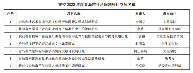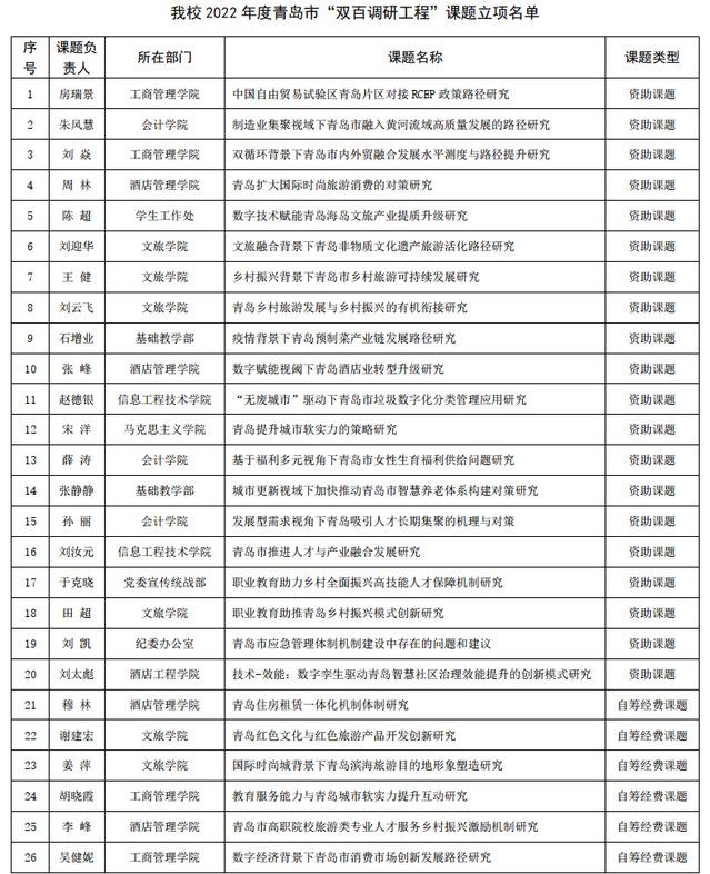 本网讯(科研发展处)近日,青岛市“双百调研工程”领导小组办公室、青岛市哲学社会科学规划管理办公室相继公布了2022年度青岛市“双百调研工程”课题、青岛市社科规划项目的立项结果,必赢官网成功立项26项青岛市“双百调研工程”课题和7项青岛市社科规划项目,立项数在全部申报单位中均位居前列。