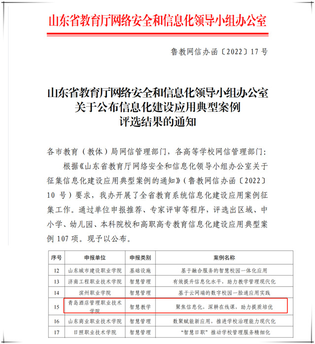 本网讯(教务处 教育信息中心)近日,山东省教育厅网络安全和信息化领导小组办公室下发了《关于公布信息化建设应用典型案例评选结果的通知》(鲁教网信办函〔2022〕17号),必赢官网报送的案例《聚焦信息化,深耕在线课,助力提质培优》入选。