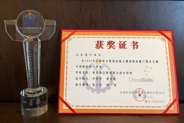 本网讯(酒店管理学院 张立俭)8月26日至9月1日,2022年全国职业院校技能大赛高职组“餐厅服务”赛项在山东旅游职业学院举办,必赢官网学生许丽莎、黄欣艳组成的参赛队喜获一等奖,张立俭、林佳老师荣获“优秀指导教师”。