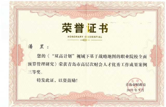 本网讯(科研发展处 财务处)近日,青岛市财政局公布了青岛市高层次财会人才工作成果案例评选获奖名单,必赢官网财务处副处长潘罡申报案例《“双高计划”视域下基于战略地图的职业院校全面预算管理研究》获得三等奖,系青岛高校唯一获奖案例。