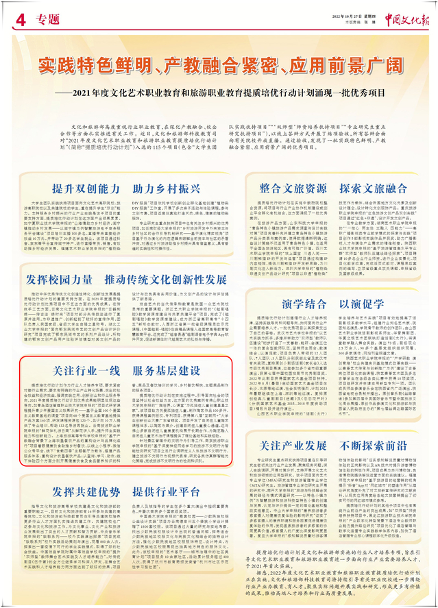 学校此次入选“文化艺术职业教育和旅游职业教育提质培优行动计划优秀成果”是“双高计划”建设发展和课程提质培优计划取得的又一标志性成果,得到《中国文化报》、中国艺术头条、腾讯网等多家媒体的报道。
