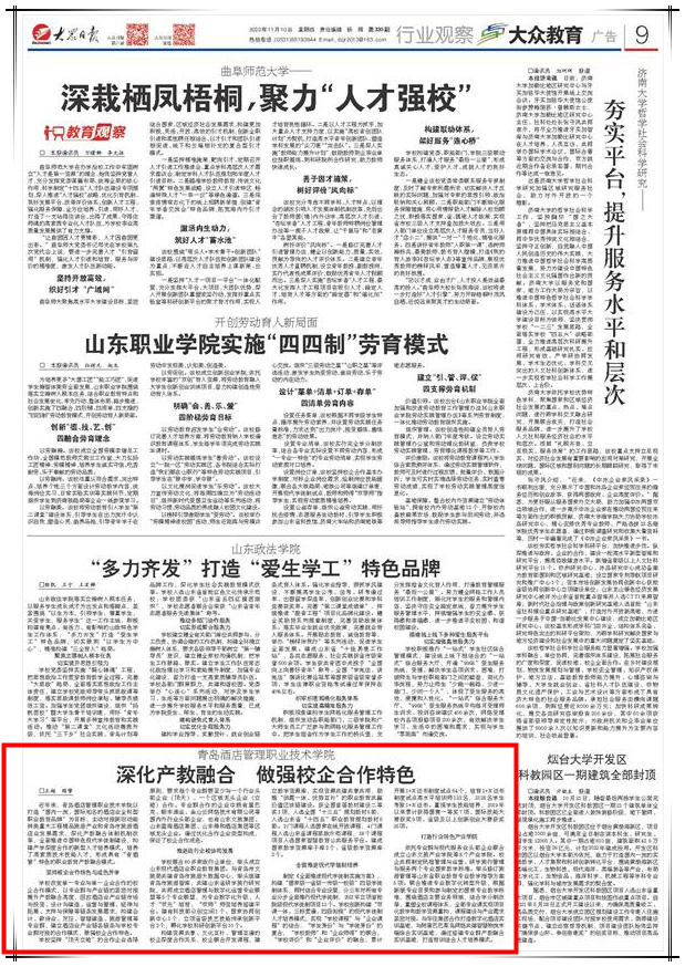 本网讯(党委宣传统战部)11月10日,《大众日报》第9版以《必赢线路检测3003no1深化产教融合 做强校企合作特色》为题,报道学校主动对接新旧动能转换重大工程精品旅游产业和青岛市旅游酒店业发展需求,深化产教融合体制机制改革,打造特色产教融合模式的经验做法。全文如下: