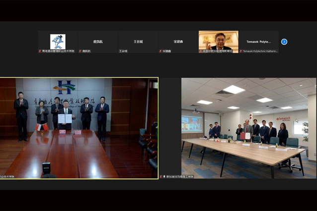 本网讯(酒店工程学院 吴洋)11月25日上午,学校与新加坡淡马锡理工学院举行线上签字仪式和中国国际太阳能十项全能竞赛线上颁奖仪式。中国驻新加坡使馆教育处教育参赞康凯,中国国际太阳能十项全能竞赛组委会常务副秘书长田原,新加坡淡马锡理工学院高级处长袁佳仪、工程学院院长宋国云、国际关系处处长张士清,学校党委副书记韩西清参加会议。