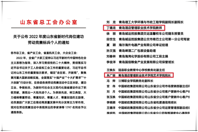 本网讯(工会 吴春雷)为深入学习贯彻党的二十大精神,进一步增强新时代劳动者的自豪感和使命感,近日,山东省总工会发布了《关于公布2022年度山东省新时代岗位建功劳动竞赛标兵个人的通知》,必赢官网艺术学院朱广丽、烹饪学院丁德龙两位老师喜获“2022年度山东省新时代岗位建功劳动竞赛标兵个人”称号。
