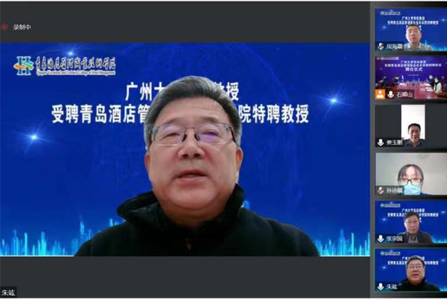 姜玉鹏在致辞中对朱竑教授受聘学校特聘教授表示热烈欢迎和感谢,并介绍了学校发展和“双高计划”建设情况。他表示,学校正以“双高计划”建设为契机,以推动高质量发展为主题,以内涵建设和特色发展为主线,开启职业教育提质培优综合改革,期待朱竑教授指导、提升学校师资队伍的科研水平和协同创新水平,助力教师在国家级课题和其他重大教科研项目中取得新突破,促进专业学术带头人的学术水平和影响力提高,在旅游类学科专业建设、人才培养、教学研究、师资队伍建设等方面提供智力支持。