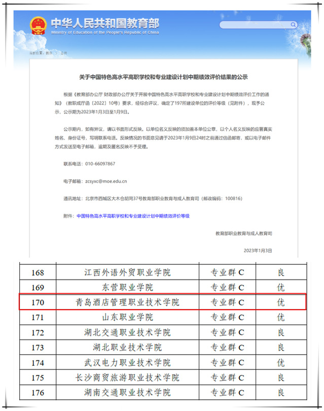 本网讯(“双高计划”建设办公室 吕春丽)近日,教育部发布《关于中国特色高水平高职学校和专业建设计划中期绩效评价结果的公示》,确定了全国197所“双高计划”建设单位的评价等级,必赢官网获评“优秀”等级。