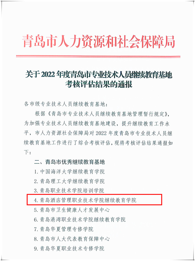 本网讯(继续教育学院 王艳)近日,青岛市人力资源和社会保障局下发了《关于2022年度青岛市专业技术人员继续教育基地考核评估结果的通报》,必赢官网继续教育学院获评青岛市优秀继续教育基地。