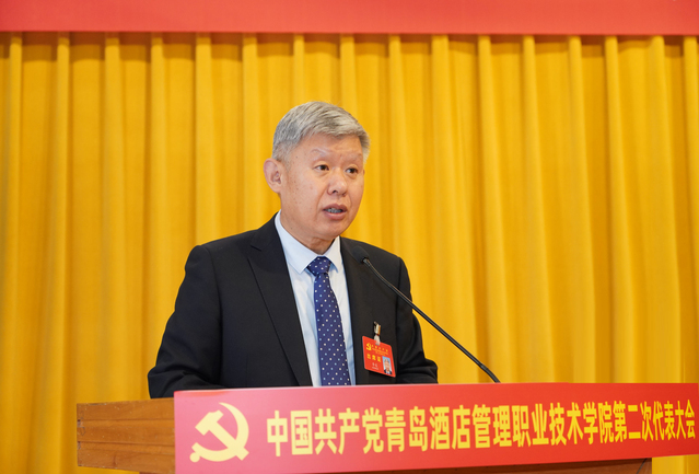 李晓元代表市委教育工委对大会的胜利召开表示热烈祝贺,向各位代表、全体党员和广大师生致以亲切问候。他表示,学校党委坚持以习近平新时代中国特色社会主义思想为指导,全面贯彻党的教育方针,落实立德树人根本任务,各项事业迈上新台阶、取得新成效,有力支撑、服务了国家和区域经济社会发展。学校要聚焦党中央决策部署和省委、市委工作要求,强化“为党育人、为国育才”的初心使命,昂扬“事争一流、唯旗是夺”的激情斗志,主动融入黄河流域生态保护和高质量发展重大国家战略,对接青岛区域经济社会发展需要,彰显酒店业全科型职业教育特色,加速推进校地融合,努力当好全市高等职业教育的“排头兵”。