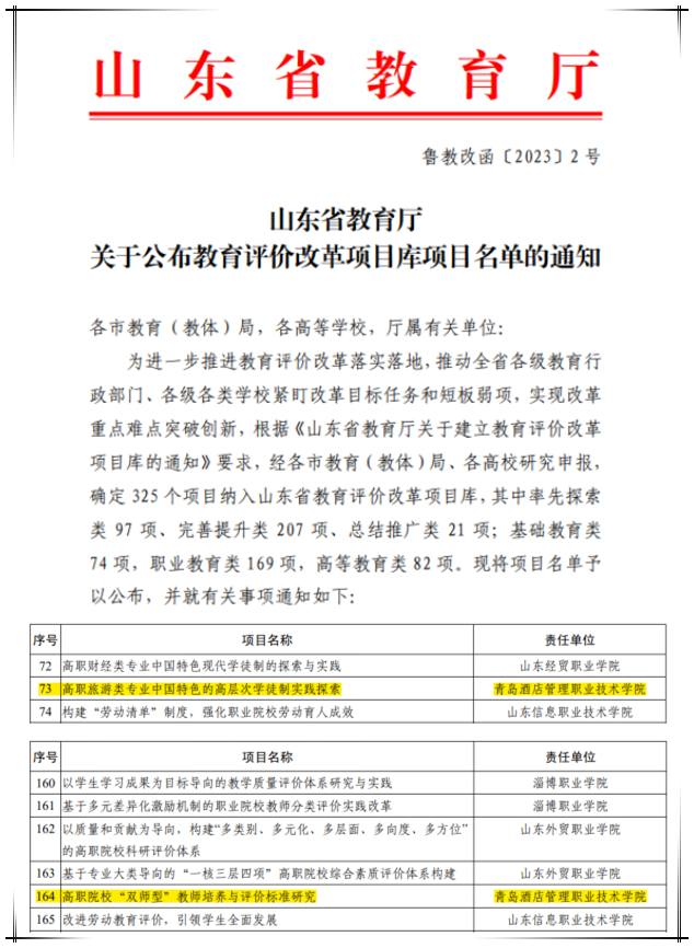 本网讯(组织人事处 张妍)近日,山东省教育厅公布教育评价改革项目库项目名单,必赢官网教务处牵头的率先探索类《高职旅游类专业中国特色的高层次学徒制实践探索》和组织人事处牵头的完善提升类《高职院校“双师型”教师培养与评价标准研究》两个项目全部成功入库。