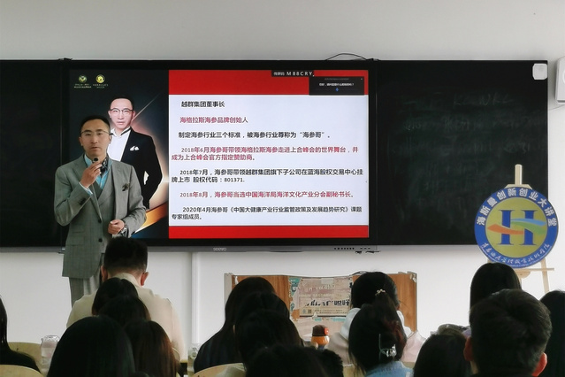 本网讯(基础教学部 张会强)为提高学生的创新思维,拓宽学生就业视野,帮助学生认清当前就业形势,4月11日,基础教学部启动海斯曼创新创业大讲堂品牌活动,首场活动特邀海格拉斯海参品牌创始人张伟先生开展专题讲座。