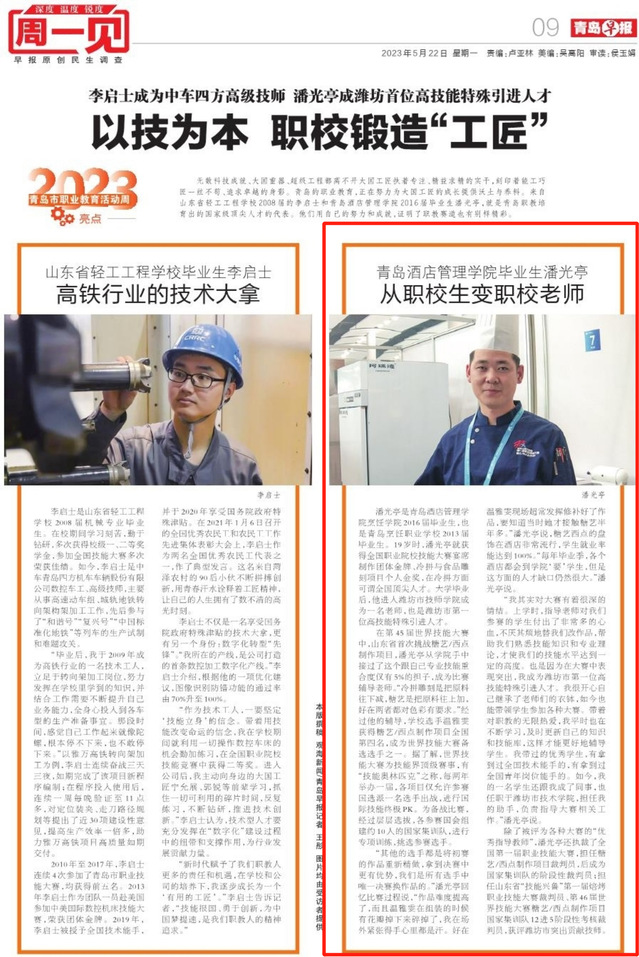 无数科技成就、大国重器、超级工程都离不开大国工匠执着专注、精益求精的实干,刻印着能工巧匠一丝不苟、追求卓越的身影。青岛的职业教育,正在努力为大国工匠的成长提供沃土与养料。来自山东省轻工工程学校2008届的李启士和青岛酒店管理学院2016届毕业生潘光亭,就是青岛职教培育出的国家级顶尖人才的代表。他们用自己的努力和成就,证明了职教赛道也有别样精彩。