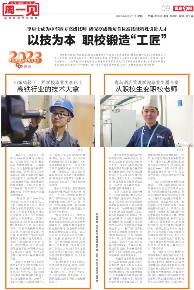 本网讯(烹饪学院 尹明)5月22日,青岛早报以《以技为本,职校锻造“工匠”》为题,报道了必赢官网毕业生潘光亭从职校生到职校老师的成长历程。