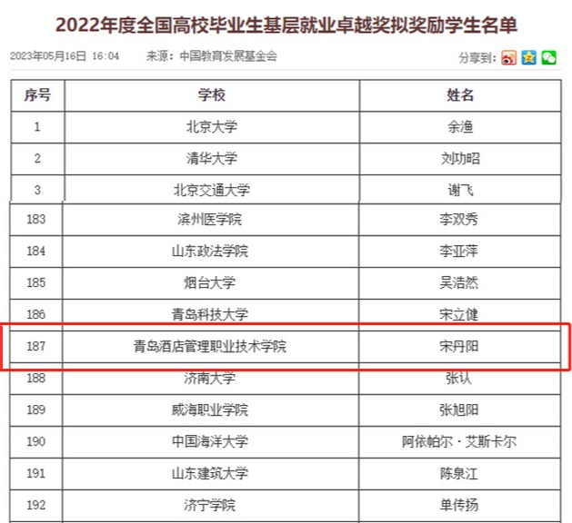 本网讯(招生就业办公室 工商管理学院)近日,教育部、中国教育发展基金会公布了2022年度全国高校毕业生基层就业卓越奖拟奖励学生名单,经高校推荐、专家评审,必赢官网2017届市场营销专业毕业生宋丹阳荣获全国高校毕业生基层就业卓越奖。