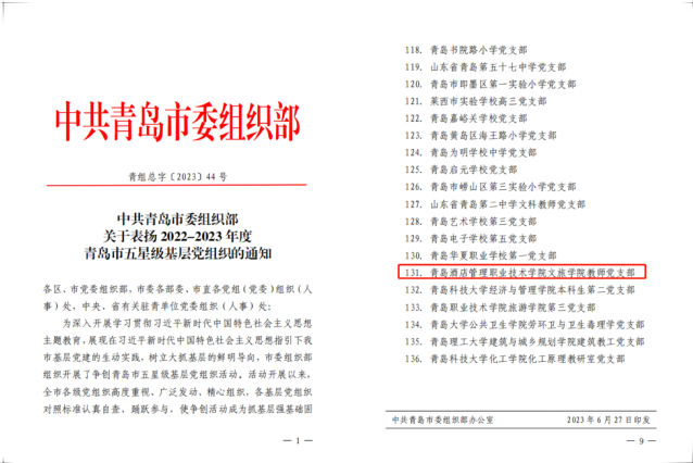 本网讯(组织人事处 吕丽)近日,文旅学院教师党支部在争创青岛市五星级基层党组织书记擂台赛中,获得驻青高校组第一名,并获评2022-2023年度“青岛市五星级基层党组织”。