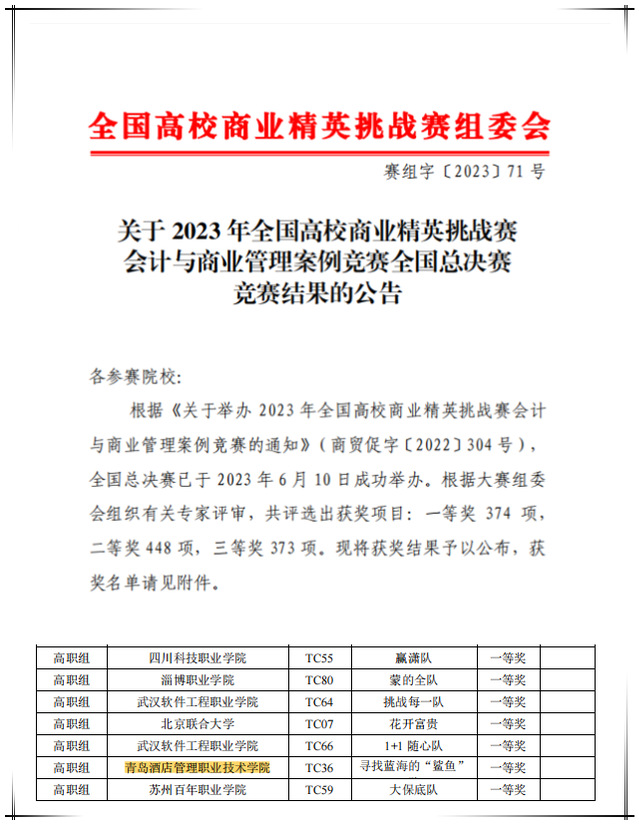 在全国高校商业精英挑战赛中,会计学院赵馨怡、齐庆馨、贾文婷、韩世豪4名学生组成的“寻找蓝海的‘鲨鱼’队”荣获高职组全国一等奖。在全国商科教育实践教学大赛中,刘凯老师的“基于实践教学平台的‘税务会计’课程实践教学方案设计”获课程建设实践教学方案设计二等奖,徐凯、赵颖慧老师的“证券投资实务课程实训工作手册”获配套实践教学方案设计三等奖,李楠、刘凯、王萍老师的“出纳业务操作”及李新彦老师的“预算与绩效管理”分别获多媒体教学课件大赛一等奖和三等奖,黄媛老师的“收入数据洞察”及丁冰、赵颖慧老师的“机动车辆保险业务处理”分别获微课教学大赛一等奖和三等奖。在全国商科教育科研课题大赛中,李真老师的《数智化背景下高职院校财会智慧学习工场的构建研究》及沙珍珍老师的《乡村振兴视域下商科类专业创新创业人才培养路径研究》获论文类二等奖,黄媛、魏源、薛涛、李新彦老师的“酒店财务现代学徒制试点项目教学案例”及鞠维欣、高琳、苗小爱老师的“大数据应用基础——基于Python金融企业实战案例”获教学案例类三等奖,王萍、李新彦、黄媛、李楠老师的《三教改革背景下企业与高职院校教师互聘机制构建研究》获论文类三等奖。