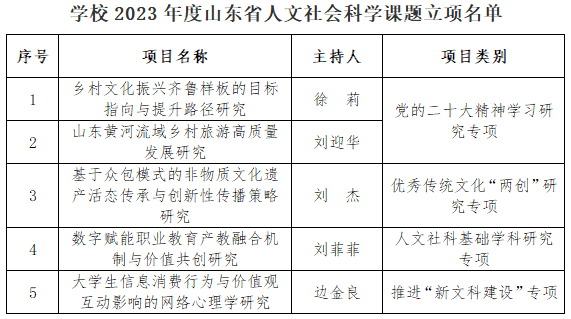 本网讯(科研发展处)近日,山东省人文社会科学课题管理办公室公布了2023年度山东省人文社会科学课题(重大招标课题、专项研究课题)立项名单,必赢官网立项5项专项研究课题。