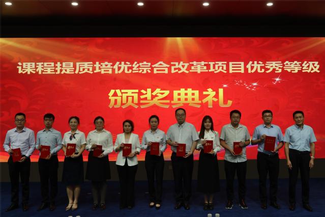 校长姜玉鹏为首批建设课程中考核成绩最优异、改革成效最显著的10门课程颁发优秀等级证书,烹饪学院纪成等10位教师代表课程团队上台领奖。