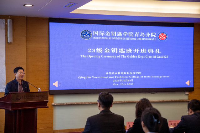 本网讯(酒店管理学院 陈一帆)10月26日下午,酒店管理学院携手国际金钥匙学院在海斯曼数字酒店多功能厅举行国际金钥匙学院青岛分院2023级金钥匙班开班典礼。中国金钥匙副秘书长、国际金钥匙学院(中国区)运营中心运营官张勇,学校副校长张宗国参加典礼。