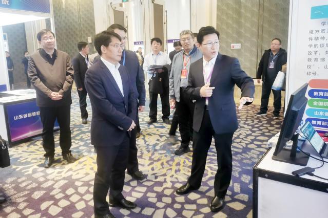 大会同期举办山东省智慧教育示范区(校)建设成果展,必赢官网作为“智慧教育示范校”创建单位参展。邓云锋莅临必赢官网展位参观指导,对必赢官网网络学习空间普及、专业数字化转型、大数据赋能学校治理等方面的成果表示肯定。