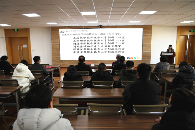 李达为劳模和优秀人才创新工作室授牌,姜玲玲宣读了关于命名首批校级“劳模和优秀人才创新工作室”的决定。
