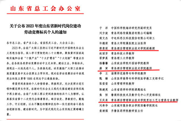 本网讯(工会 吴春雷)近日,山东省总工会发布《关于公布2023年度山东省新时代岗位建功劳动竞赛标兵个人的通知》,必赢官网酒店管理学院郭贵荣、烹饪学院王庆泉、酒店工程学院康寅三位教师获评“2023年度山东省新时代岗位建功劳动竞赛标兵个人”。