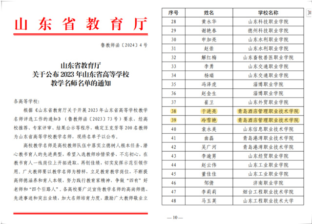 根据《山东省教育厅关于开展2023年山东省高等学校教学名师评选工作的通知》要求,2023年山东省高等学校教学名师共计评选200名,其中高等职业院校80名。针对此次教学名师评选,学校高度重视,通过宣传动员、个人申报、资格审查、二级学院推荐、专家评审、学校党委会审定、候选人公示等环节,最终确定于进亮教授、冷雪艳教授作为学校推荐人选参与省级教学名师的评选,并最终在全省教学名师评审中脱颖而出。